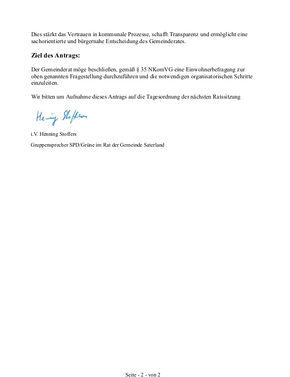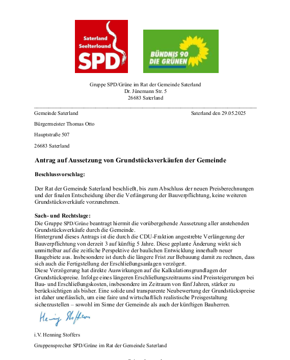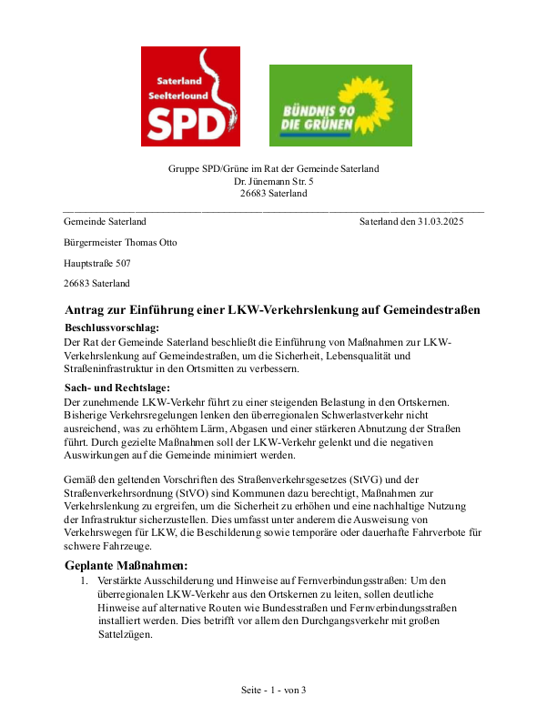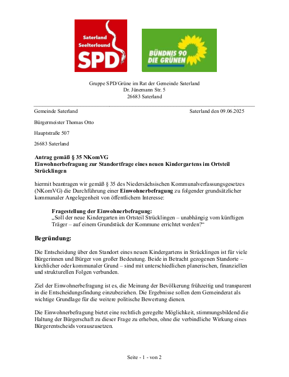 Anträge der Gruppe SPD /Grüne im Rat der Gemeinde Saterland ab 01.01.2025